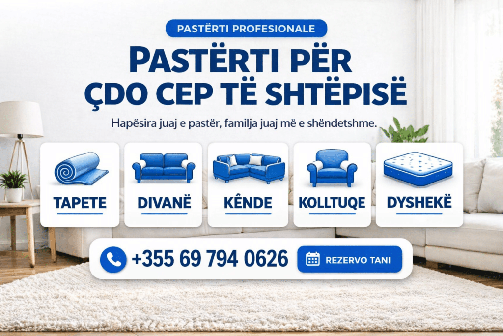 Ofrojmë larje tapetash në Tiranë me teknologji profesionale për pastrim të thellë. Tapetet grumbullojnë pluhur, baktere dhe erëra të padukshme që nuk hiqen me metoda normale. Me pajisjet tona profesionale, realizojmë pastrim tapetash profesional duke eliminuar papastërtitë në thellësi dhe duke rikthyer freskinë natyrale.